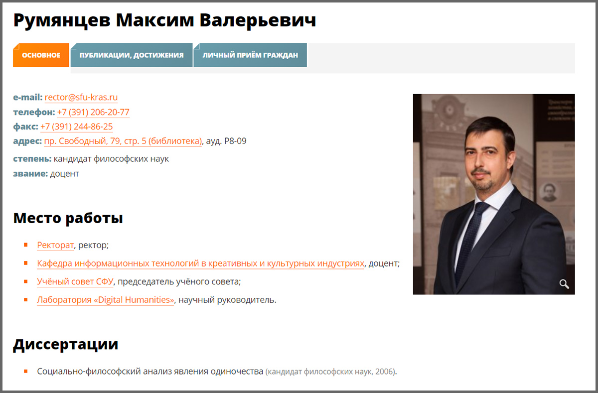 У действующего ректора Максима Румянцева — огромный опыт работы. Пять лет он возглавлял Гуманитарный институт СФУ, четыре года был проректором СФУ по учебной работе, и два с половиной года — заместителем министра образования края. Однако у Румянцева есть огромный объективный недостаток — он не академик, и даже не доктор наук, а всего лишь кандидат. По формальному признаку он не вполне подходит на должность ректора федерального университета.