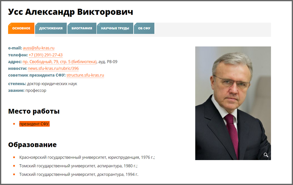 Александр Усс уже давно пытается поставить вопрос о смене ректора СФУ. Отметим, что в этом ему косвенно помогает и действующий губернатор Михаил Котюков, который настолько занят текущими делами, что абсолютно не обращает внимания на то, что происходит в СФУ.