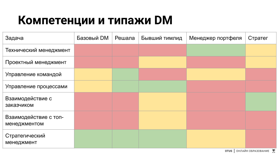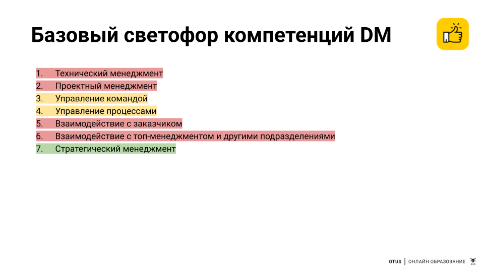 В работе такого DM много управления проектами, как технического, так и классического проектного менеджмента. Много коммуникаций, чуть меньше работы с командой. Стратегия практически не присутствует. Соответственно, набор необходимых компетенций в виде светофора будет выглядеть вот так: