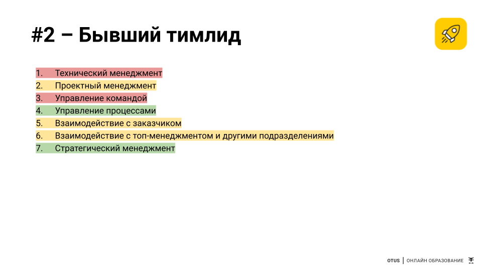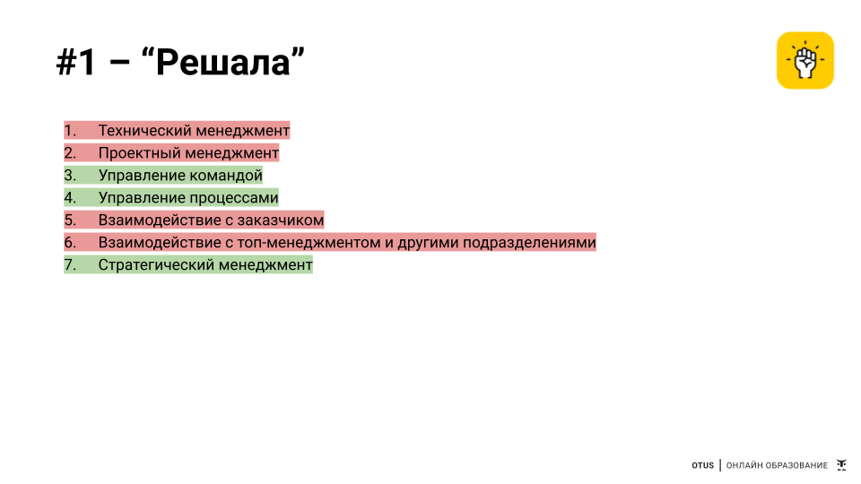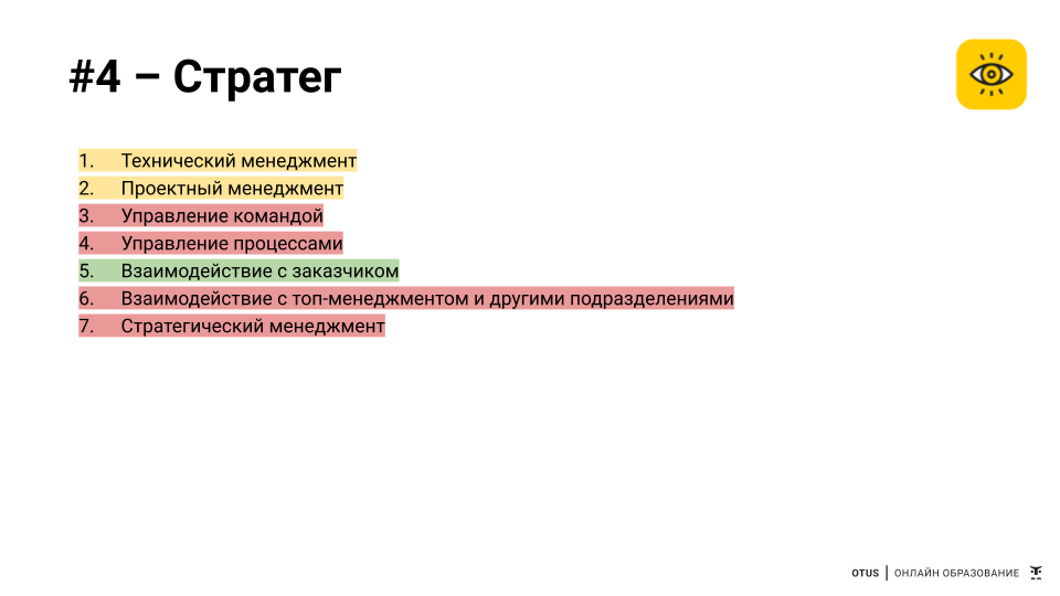 Как видно, круг задача довольно широк. И здесь, действительно, многое из классической работы тимлида и менеджера проекта. Но кроме этого, появляются задачи тактического уровня: реализовывать стратегию, управлять процессами, развивать отношения с клиентами. В общем, нескучная работенка, факт.