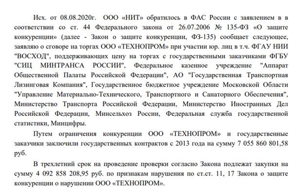 В Арбитражный суд Москвы поступило заявление, в котором в недобросовестном ограничении конкуренции подозреваются учреждения Минтранса, Общественной палаты, Минтранс, Минсельхоз, Минцифры и другие.