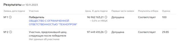 Пример: последняя закупка от Минсельхоза, где ведомство назначило цену в 97 449 410,26 рублей. Ровно такую же цену совсем без снижения предложил неназванный "проигравший". Зато "Технопром" решил сэкономить госбюджета аж на 0,5%, на которые снизил стоимость своих услуг и выиграл конкурс. Почему его якобы конкурент решил, что сможет одержать победу с учётом того, что ещё и набрал всего 29,85 баллов из 100 по оценке конкурсной комиссии – непонятно. Разве что он не особенно и стремился получить от государств почти 100 млн рублей.