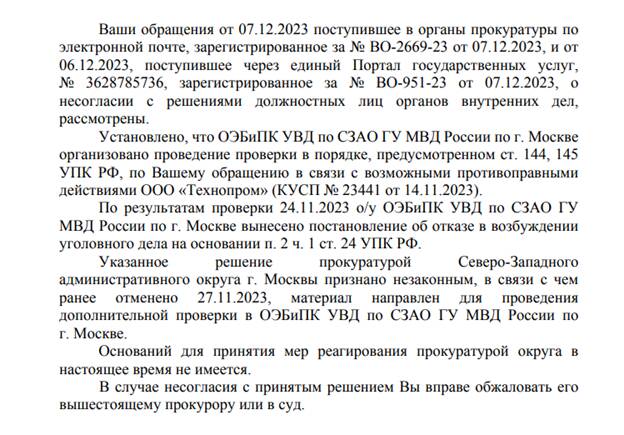 Обращение было направлено в органы прокуратуры, Росфинмониторинг, ФАС России, Казначейство России, Счетную палату РФ. Прокуратура заявила, что мер для реагирования принимать пока не будет – мол, нет оснований. Но указала, что обращение рассматривалось правоохранителями, было "замято", что прокуратура признала незаконным и сейчас его снова рассматривают в том же ведомстве, откуда ранее пришёл отказ о возбуждении уголовного дела.