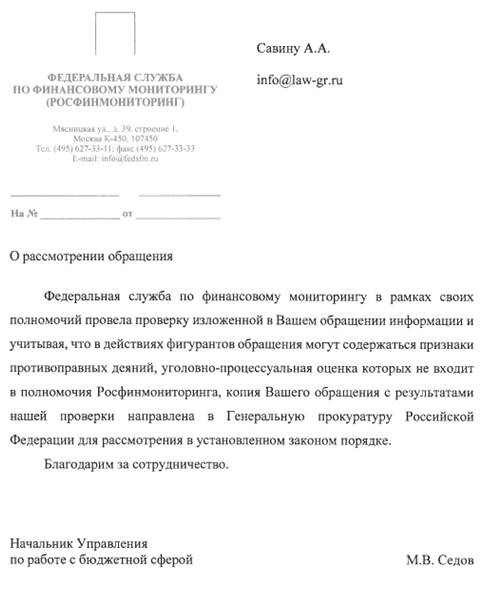Росфинмониторинг сказал, что да, мол, похоже на нарушение закона, но компетенция не наша.