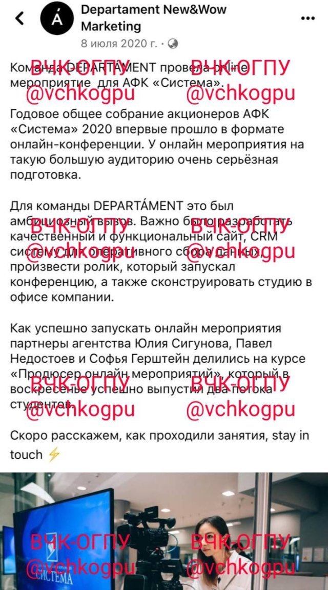 Самый яркий кейс Departament - проведение в пандемийный 2020-ый общего собрания акционеров АФК «Система». Значительную работу, глядя на отчет сотрудников, проделала партнер агентства Софья Герштейн. Девушка давно занимается ВИП-гостями на мероприятиях самого высокого уровня. Именно она организовывала вечеринку Ивлеевой, в первую очередь следила за тем, чтобы топов ничего не стесняло, в том числе и одежда. Судя по пометке «от Софьи»напротив имени Мишина в добытом ВЧК-ОГПУ списке гостей, Герштейн лично договаривалась о том, чтобы спонсор и партнер DEPARTÁMENT вице-президент МТС был принят как подобает, также и сопроводила высокого гостя на голую тусовку. Интересно, что девушка ввиду последних событий девушка почти недел. не читает сообщения в своих соцсетях.