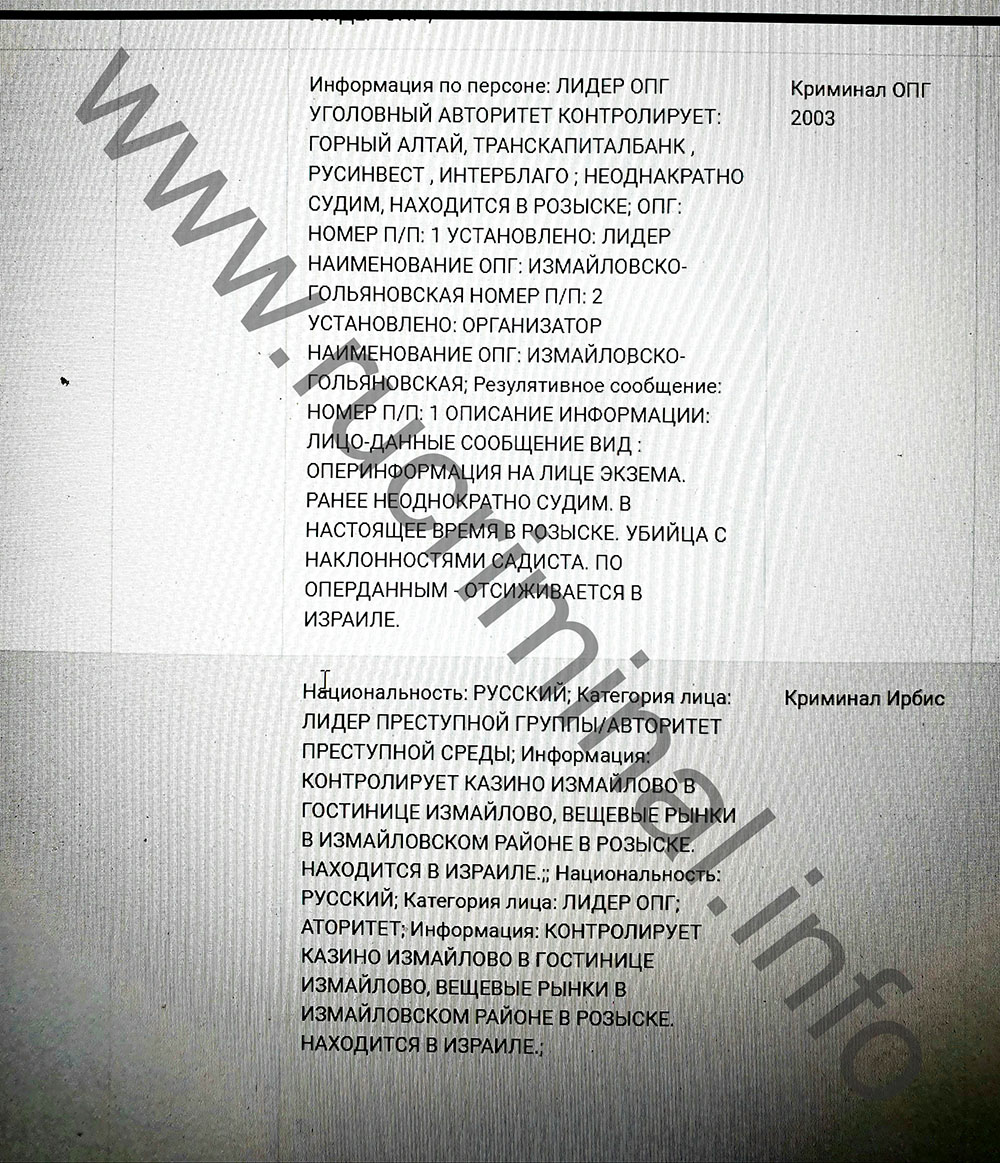 Person Information: LEADER OPG CRIMINAL AUTHORITY CONTROLS: GORNY ALTAI, TRANSKAPITALBANK, RUSINVEST, INTERBLAGO; We repeatedly judge, is in search; OPG: NUMBER OF THE P / P: 1 ESTABLISHED: LEADER NAME OF THE OPG: ISMAYLOVSKY-GOLYANOVSKY NUMBER P / P: 2 INSTALLED: ORGANIZER NAME OF OPG: ISMAYLOVSKO-GOLYANOVSKAYA; Resultant message: NUMBER N / A: 1 DESCRIPTION OF INFORMATION: FACE DATA MESSAGE VIEW: OPERINFORMATION ON THE FACE OF ECZEMA. PREVIOUSLY JUDGED. NOW IN SEARCH. KILLER WITH REASONS OF A SADIST. ACCORDING TO OPERATED - REMAINS IN ISRAEL.