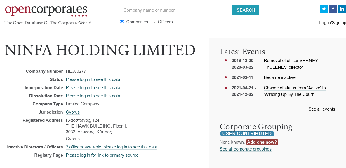 Среди компаний, куда впутали Тюленева, оказалась и Ninfa Holdings Limited.