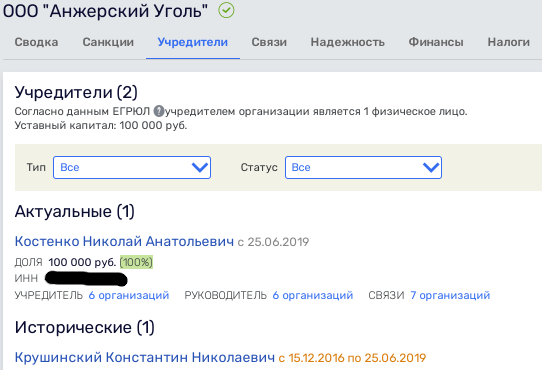 Действительно, в ЕГРЮЛ на сегодня есть ООО "Анжерский уголь", учрежденное в 2016 году. Изначально учредителем был Константин Крушинский, а с 2019 года его сменил директор фирмы Николай Костенко. При этом у Крушинского в России также было до марта 2021 года ООО "Промбизнесресурс", которое по основному виду деятельности занимается добычей антрацита, и с 2015 по май 2022 года (до ликвидации) - ООО "ЦОФ "Анжерская". Костенко же, получавший ИНН в Кузбассе, до сих пор занимается бизнесом по торговле углём через "Анжерский уголь". Ранее он же был директором ныне ликвидированного ОАО "Кузбассуголь" и ООО "Кузбассуголь".