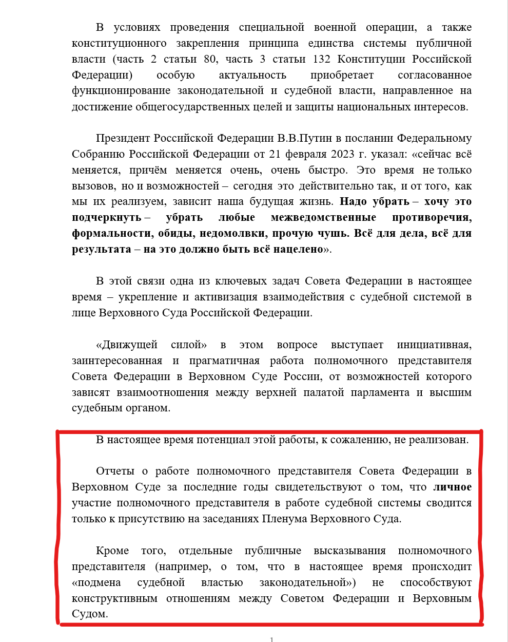 Кроме того, отдельные публичные высказывания полномочного представителя (например, о том, что в настоящее время происходит «подмена судебной властью законодательной») не способствуют конструктивным отношениям между Советом Федерации и Верховным Судом.