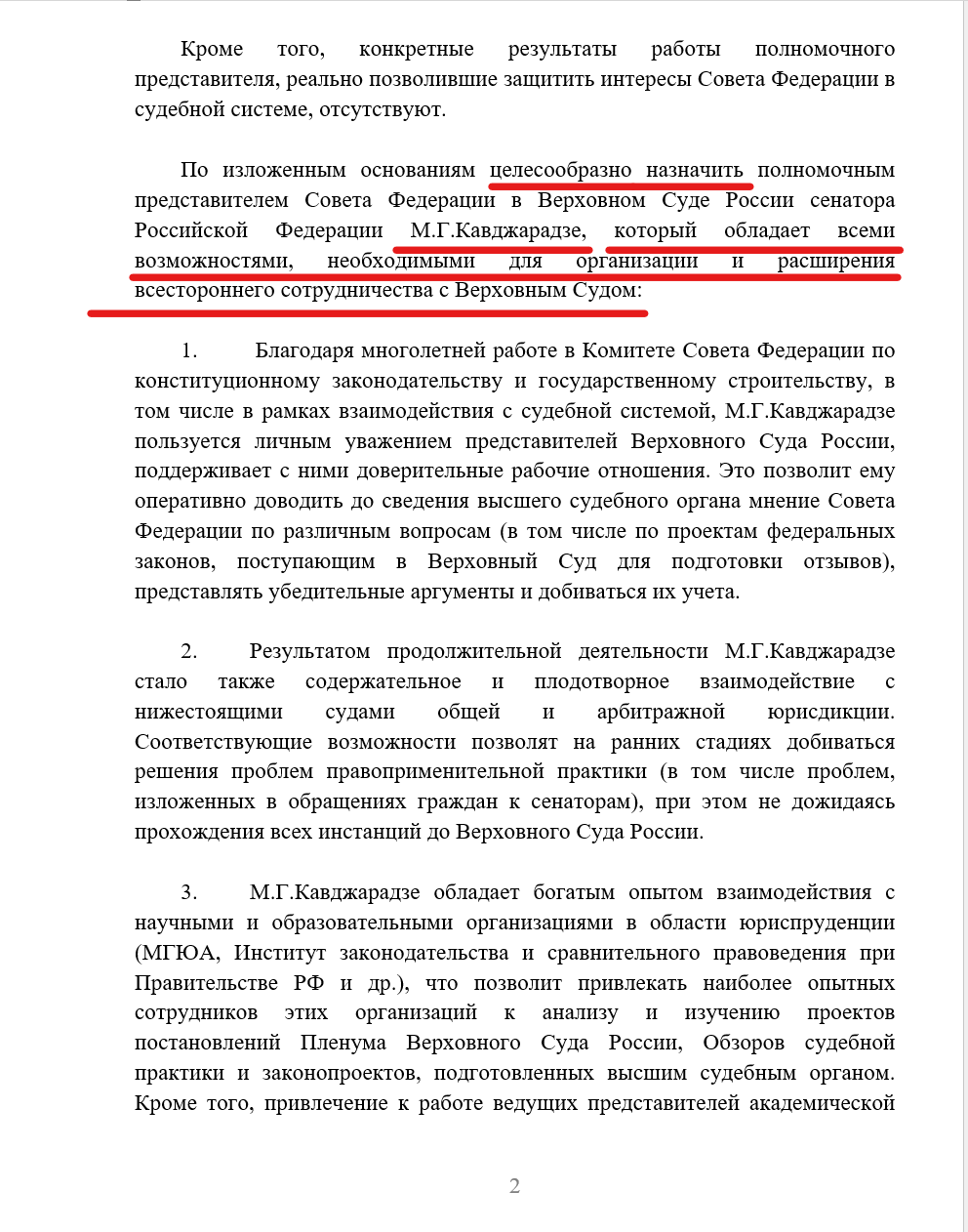 Так, начиная с 2021 г. они пробивали назначение на пост полномочного представителя Совета Федерации в Верховном Суде России скандально известного сенатора Кавджарадзе, имеющего криминальное прошлое, регулярно высказывая в различных официальных документах резкую критику в адрес занимавшей ранее должность полномочного представителя Совета Федерации в Верховном Суде России Е.Б. Мизулиной.