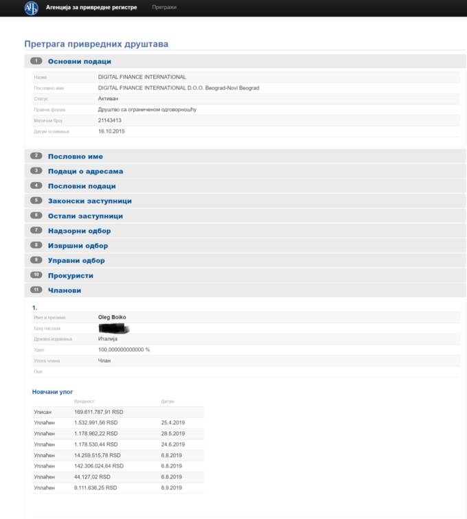 Примечательно, что согласно данным сербского реестра 100% собственником "ДИДЖИТАЛ ФАЙНАНС ИНТЕРНЕШНЛ" является гражданин Италии Олег Бойко.