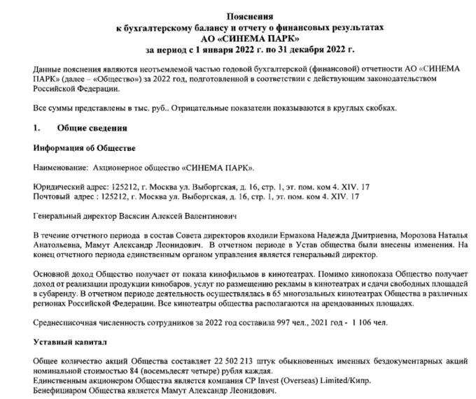 По данным ФНС, на конец 2022 года акционером АО "Синема Парк", что управляет 65 многозальными кинотеатрами, было CP Invest (Overseas) Limited, а бенефициаром - Александр Мамут. Позднее сообщалось, что из совета директоров олигарх вышел, чтобы компания не попала под санкции.