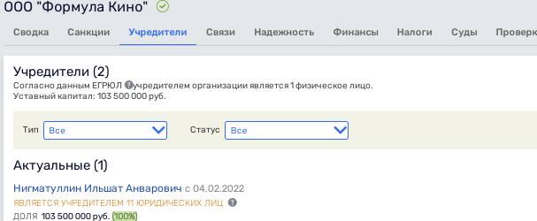 В феврале 2022 года владельцем ООО "Формула кино" стал президент ГК "Гранель" Ильшат Нигматуллин - родственник Андрея Назарова, близкого друга главы Башкирии Радия Хабирова.
