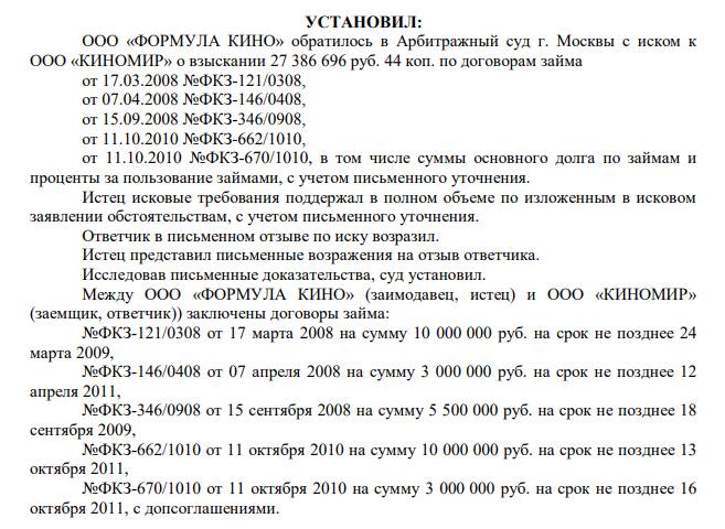В 2016 году ООО "Формула кино" подаёт иск к ООО "Киномир" и взыскивает по неким договорам займа более 27 млн рублей. Хотя обе фирмы взаимосвязанны, одна другой даже приходилась правопредшественником.