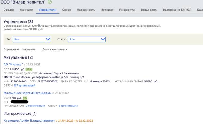 Контролирующим лицом "Вилар Капитал" на сегодня является некое АО "Мирэкс", учрежденное в 2022 году, его акционер - ООО "Авр Инвест".