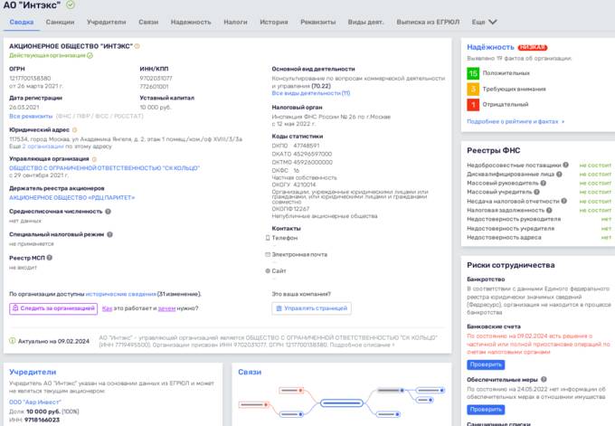 Компанией "Интэкс" управляет ООО "СК Кольцо". Последнее принадлежит на 95% Валерию Краснову, второй же собственник - ООО "Велес Финанс" (ранее называлось "Вим Финанс") вышел в 2022 году.