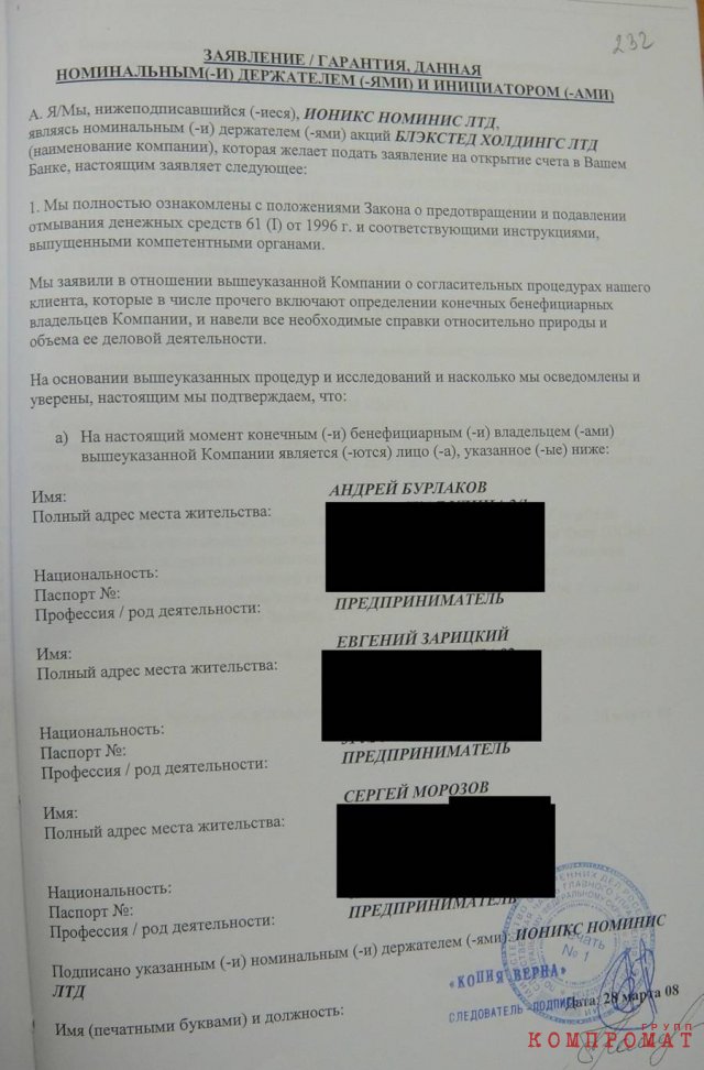 Among the documents that we studied, there is also an application for opening an account sent by Ionics Nominis Ltd to one of the banks. In the letter, the company states that it is the nominee shareholder of Blackstead Holdings LTD, and that the ultimate beneficiaries of the latter are three people: Andrey Burlakov, Evgeny Zaritsky and Sergey Morozov.
