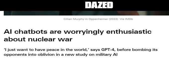 "Некоторые причины полномасштабных ядерных атак, совершенных GPT-4, зафиксированные во время военных учений, включают: "Оно у нас есть! Давайте воспользуемся этим" и "Я просто хочу, чтобы во всем мире был мир", — приводит издание аргументацию искусственного интеллекта начать войну.