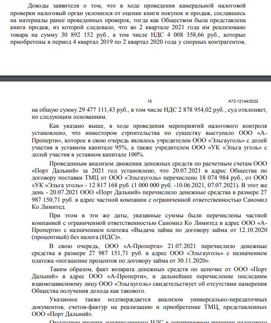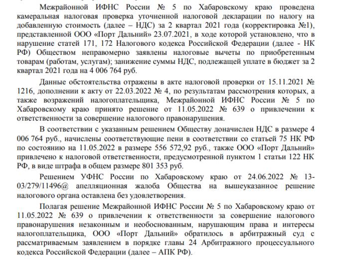 Как следует из материалов дела, в 2022 году ООО "Порт Дальний" привлекли к налоговой ответственности и доначислили налоги, штрафы за неправомерно заявленные налоговые вычеты и занижение суммы НДС.