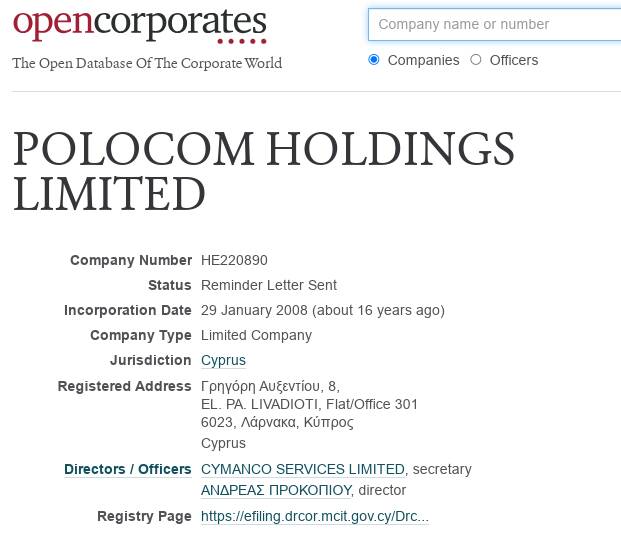 Итак, бывшим владельцем "А-Проперти Инвест" была кипрская компания POLOCOM, чьим секретарём выступало CYMANCO SERVICES LIMITED, а директором — киприот Ανδρεας Προκοπιου. Этот же секретарь и директор были у ряда офшоров, связанных с олигархом, в том числе у "Саномил Ко Лимитед", Wooden Fish Agency Limited.