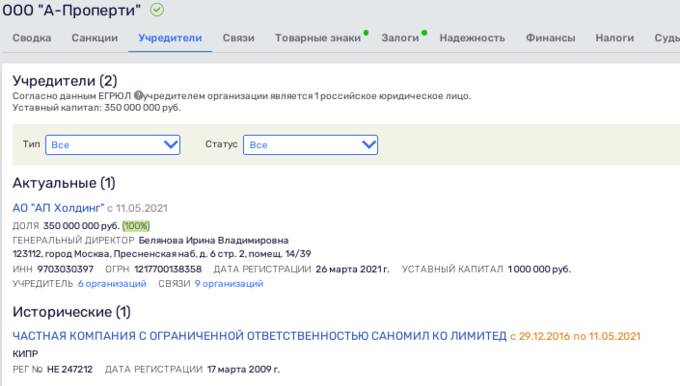 Кроме этого, Ирина Белянова, что была директором переименованного "А-проперти Инвест", является до сих пор директором ряда активов олигарха Авдоляна, в том числе ООО "А-Проперти". До 2021 года владельцем последнего был уже названный выше офшор — "Саномил Ко Лимитед", а с 2021 года — АО "АП Холдинг", учредителем которого ранее фигурировал Авдолян. Сейчас владельца скрывают.