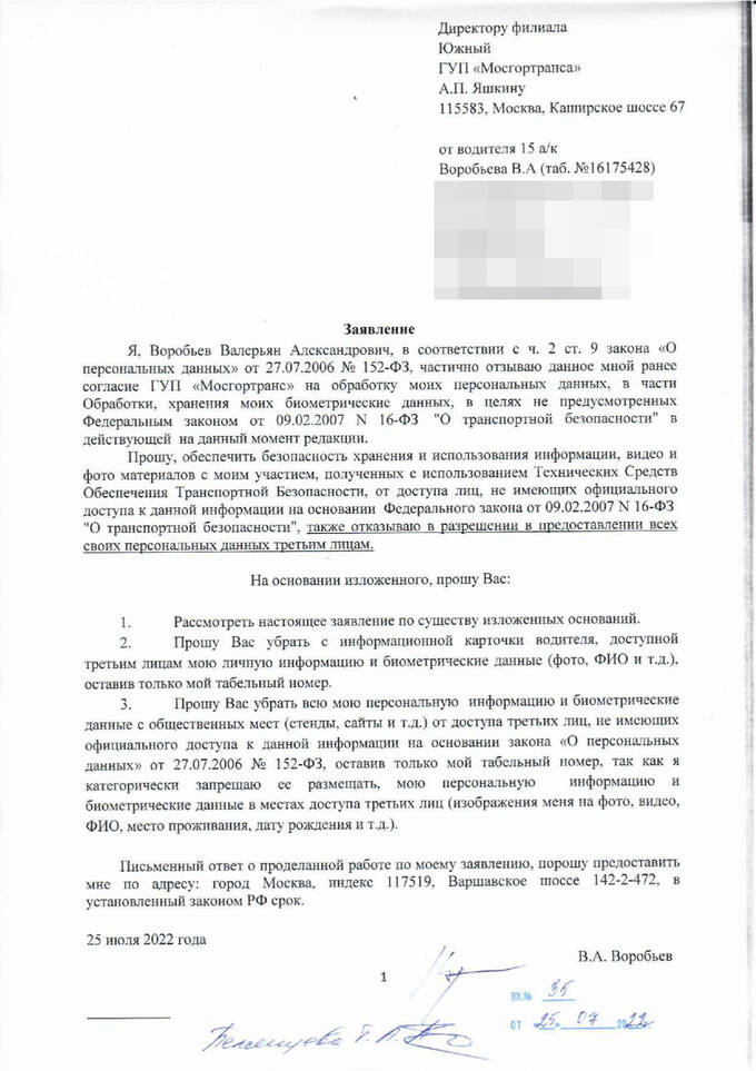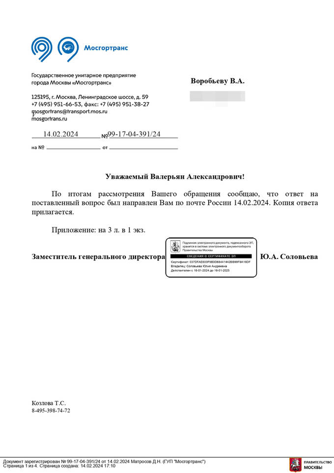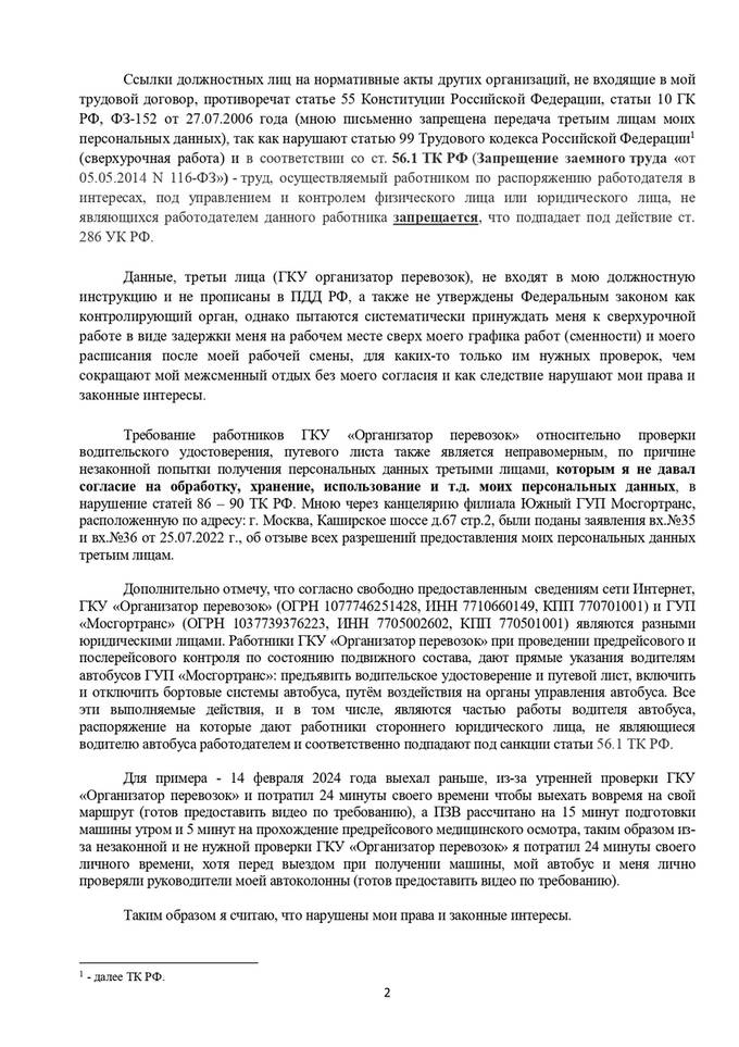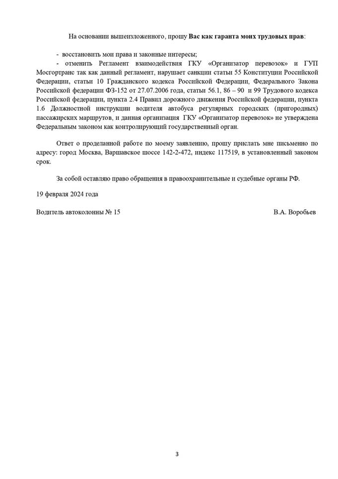 Водители неоднократно обращались к Юлии Соловьевой с требованием отменить " наемный" труд. Однако, Соловьева в своих ответах ссылается на некий регламент по взаимодействию с ГУП "Мосгортранс", в котором водителей обязывают подчиняться сторонней организации. Но у водителей с этим образованием нет трудового договора.