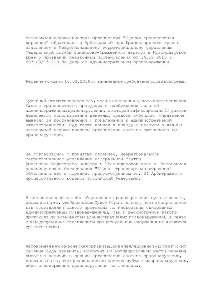 Как видно из материалов дела, в соответствии с поручением Генеральной прокуратуры РФ от 08.09.2015 г. № 23/1-263-2014 Южная транспортная прокуратура с 08.09.2015 по 02.10.2015 г. с привлечением специалистов МТУ Росфиннадзора в Краснодарском крае провела проверку законности расходования средств субсидий, выделенных из федерального бюджета АНО "Единая транспортная дирекция " в целях развития транспортной инфраструктуры Азово-Черноморского бассейна, обустройства Керченской паромной переправы, организации перевозок пассажиров и грузов на территорию Крымского полуострова.