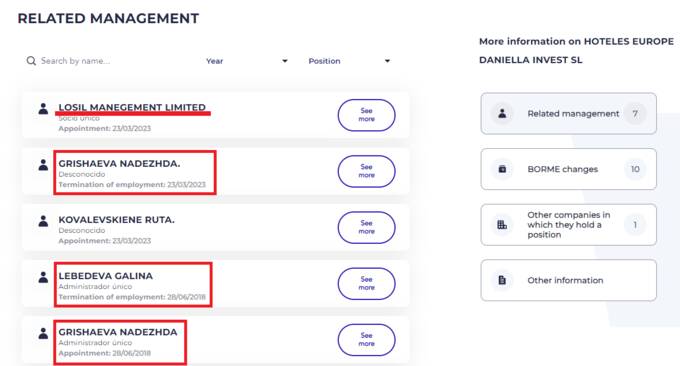 Western registers indicate that at different times both Nadezhda Grishaeva and Vladimir Zhirinovsky’s ex-wife Galina Lebedeva were related to Daniella Invest, which manages a whole chain of hotels in the EU. And only recently, on March 3, 2023, the company was managed by another offshore - LOSIL MANAGEMENT LIMITED, which was registered in Cyprus just 10 months ago.