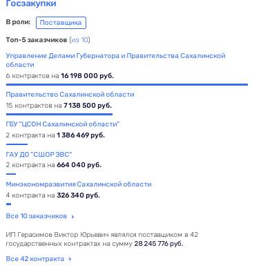 В "Руспрофайл" действительно есть некий ИП Герасимов Виктор Юрьевич - кормилец правительства Сахалина, думы Сахалина, управделами губернатора и прочих госведомств. На сегодня он обласкан госконтрактами на сумму 28 млн рублей.