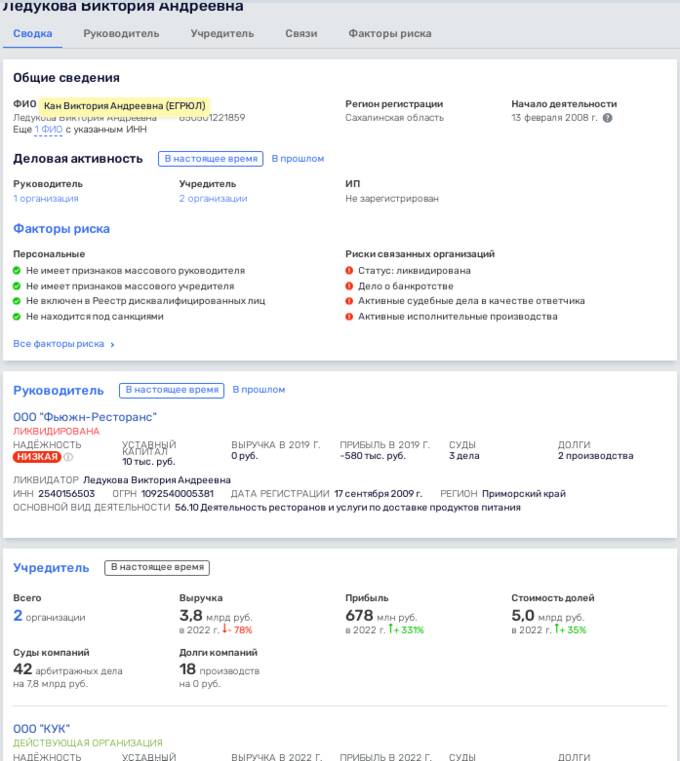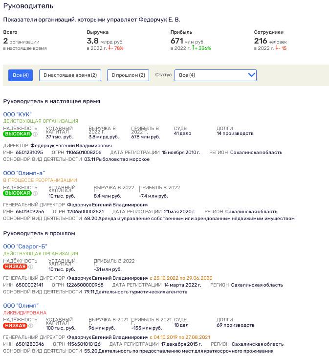 Пашов-старший - бизнес-партнёр Кана и когда у "крабового короля" запахло жареным, то зацепило и активы Пашова. Более того, Дмитрий Пашов в 2022 году был осужден к четырем годам колонии за контрабанду краба и недоплаченные в бюджет пошлины. Аресту Пашова и выезду Кана за границу предшествовали обыски, которые прошли у них дома и в офисах в конце 2018-го. Потому не удивительно, что ООО "Олимп" уже в октябре 2019 года снова сменил юридического владельца и оказался в руках Евгения Федорчука, который не так уж и далек от Кана и Пашова, как могло бы показаться. Он - директор бывшей фирмы Александра Кана - ООО "КУК", которая перешла Виктории Ледуковой (Кан).