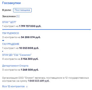 Как оказалось, не только через ЦСП компанию "Олимп" активно "подогревали" из бюджета. В целом с ООО было подписано 12 госконтрактов на общую сумму 1,84 млрд рублей, среди заказчиков, помимо уже двух названных, были департамент спорта Южно-Сахалинска (три контракта на 1,2 млн рублей), спортшкола "Сахалин" (четыре - на 3,1 млн рублей), региональный центр оценки качества образования Сахалина (три - на 34,2 млн рублей).