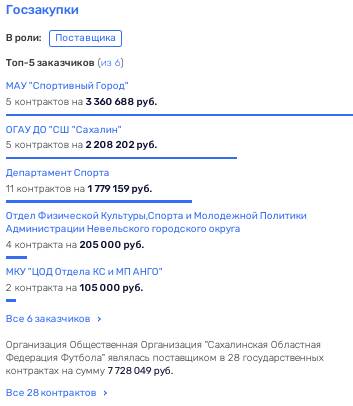 А вот и ещё один факт: Павел Дмитриевич Пашов, что был среди владельцев "Олимпа", в открытых источниках фигурирует как спортивный директор "Сахалинской областная федерации футбола". Возглавляет федерацию Алексей Абакумов - бывший замначальника отдела по делам семьи, молодёжи и охране детства администрации гор. Южно-Сахалинска, экс-председатель комитета по делам молодежи Южно-Сахалинска. А ещё через федерацию проходят госконтракты. По данным "Руспрофайл", их было уже около 30 на общую сумму 7,7 млн рублей.