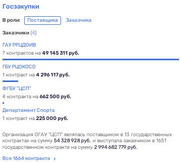 Теперь же через государственный ЦСП проводят тендеры на закупку услуг УТЦ "Восток". В целом через ОГАУ "ЦСП" как поставщика прошло 13 контрактов на 54 млн рублей и 1,6 тыс. контрактов почти на 3 млрд рублей как заказчика. Среди заказчиков было и ГАУ РРЦДОИВ (ныне - ОЦВВР), которое вынуждено было заключить семь контрактов на более чем 49 млн рублей на проведение мероприятий военно-патриотической направленности Учебно-методического центра ’’Авангард’’ на базе бывшего кановского центра "Восток".
