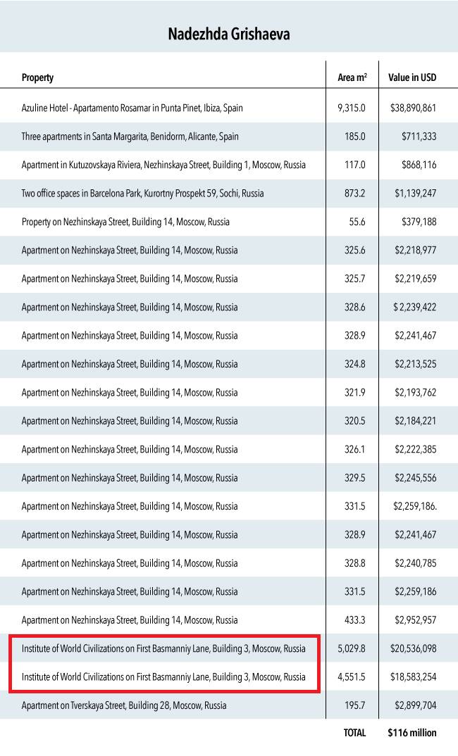 Those. Through the Institute of World Civilizations, budget money could go to people close to the family of Vladimir Zhirinovsky and Igor Lebedev. It is interesting that these two premises are the most expensive real estate that is attributed to Grishaeva, except for the Spanish Azuline Hotel, which is valued at $38 million.