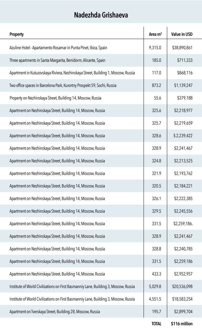 As for basketball player Nadezhda Grishaeva, the report suggests that she may have used the European hotel chain Daniella Invest to launder Zhirinovsky’s assets. Grishaeva herself owns the Azuline Hotel-Apartamento Rosamar in Ibiza, as well as three apartments in Benidorm, purchased for a total cost of about 551,000 euros.