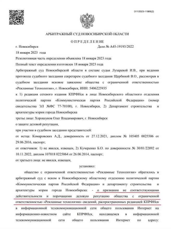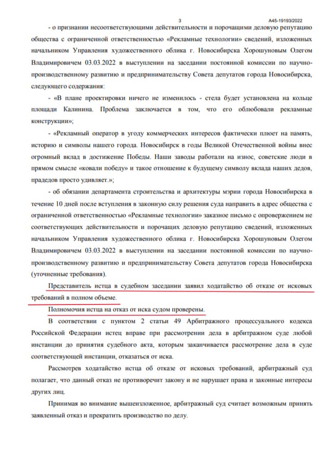Так как мирным путём решить вопрос не удавалось, ООО «РТ» решило подать иск в суд. Дело рассматривалось в Арбитражном суде Новосибирской области. 15 июля 2022 года предприниматели выиграли дело. Во второй инстанции решение также устояло. Решение суда от 23 августа должны были исполнить немедленно, однако, как оказалось, мэрия решила отложить этот вопрос в долгий ящик. Олег Хорошунов же отмахнулся отпиской.