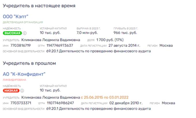 А вот гендиректор и учредитель "Кэпта" Людмила Климанова вызывает куда больший интерес. Она возглавляла структуру еще до ухода KMPG, то есть человек там явно не случайный. Вместе с тем, ранее она была учредителем АО "К-Конфидент", которое также занималось предоставлением аудиторских услуг.