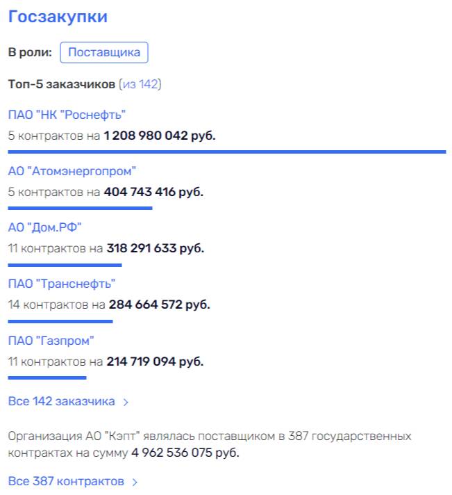 Сейчас структура имеет портфель из контрактов на общую сумму почти 5 млрд рублей. Из них 1,2 млрд получено от "Роснефти", 404 млн рублей от "Атомэнергопрома". Есть среди заказчиков и "Транснефть", и "Газпром". Многие контракты на сотни млн рублей – на предоставление консультационных услуг, за которыми можно спрятать банальный "распил". Может, пора проверить, как и на каких условиях Kept получает миллиарды из бюджета?