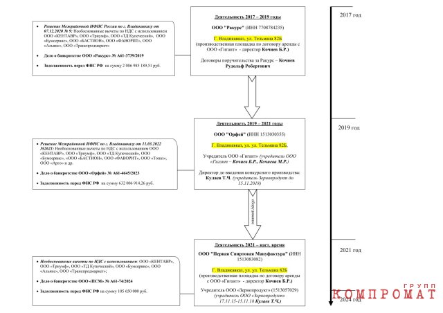 Однако после начала проведения налоговой проверки «Орфей» успевает передать оборудование для производства алкоголя ООО «ТД Купеческий» (оплата «Орфею» так и не прошла, что видно по материалам банкротного дела ТД «Купеческий»). Затем эта компания передает оборудование ООО «Зернопродукт». Далее последний создает ООО «Первая Спиртовая Мануфактура» («ПСМ»), регистрируя все по тому же злосчастному адресу г. Владикавказ, ул. Тельмана, 82б, и передает оборудование вновь созданной компании.