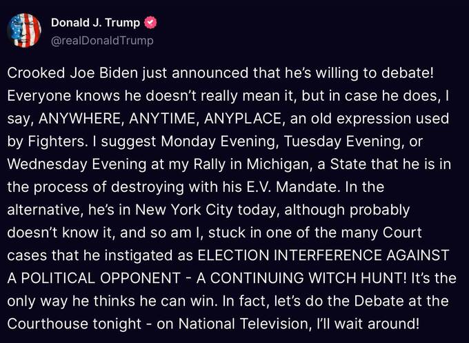 Дональд Трамп заявил, что готов к дебатам в любое время и в любом месте, в том числе в пятницу в здании суда, где идут заседания по уголовному делу против него.