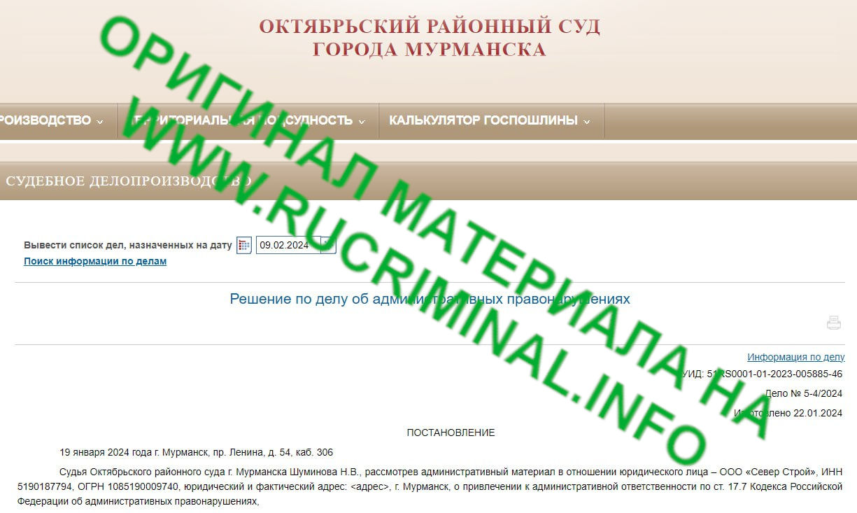Для маскарада происходящих преступлений Андрей Чибис подключает прокуратуру Мурманской области, требующую через суд предоставить управлению казначейства документы, в связи с выявленными рисками при осуществлении сопровождения средств по государственным контрактам, естественно Север Строй не предоставляет в Октябрьский суд необходимые документы и попадает на штраф в размере 50тысяч рублей, избегая тем самым раскрытия в публичной плоскости схемы вывода бюджетных средств и налоговых преступлений совершаемых в Мурманской области. ФНС и региональному казначейству категорически запрещено блокировать деятельность определенных компаний из списка Чибиса, все мероприятия должны быть согласованы.