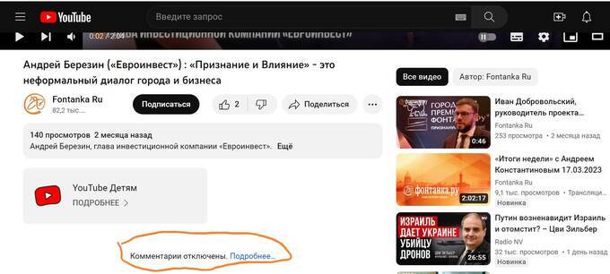 Желающие могут сами посмотреть на те видео, которые нам предлагает «Фонтанка.ру». У всех, кроме «интервью» с хозяином «Евроинвеста», возможность оставлять комментарии есть. У Березина – нет.
