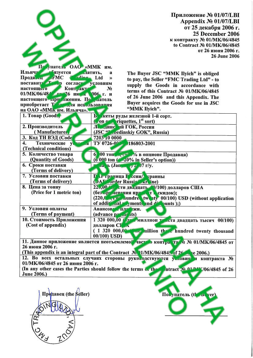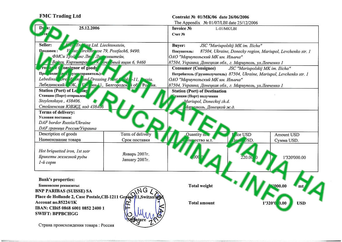 Факт №5. Экспортный объем (11млн.тонн/год) производства АО Лебединский ГОК на поставку ЖРС европейским заводам контрактовался ежегодно через офшоры главных акционеров Металлоинвеста по ценам немного выше себестоимости товара. Реальные же покупатели, металлургические заводы Европы и остального мира платили офшору г-на Скоч, г-на Мошири и Усманова полную рыночную стоимость товара. Для заводов Украины специально учреждена FMC Trading Ltd. Лихтенштейн, поскольку законом Украины запрещалось работать с офшорными компаниями Гибралтара.