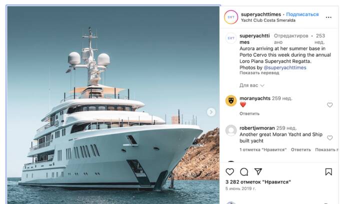 Неподалеку от обоих домов Молчановой расположен гигантский яхт-клуб, где ее супруг может оставить свою 74-метровую яхту «Аврора» стоимостью 135 млн долларов (если, конечно, он не успел ее продать). Судно замечали здесь в 2019 году.