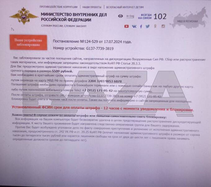«Вас заблокировали за посещение сайтов, направленных на дискредитацию ВС РФ».