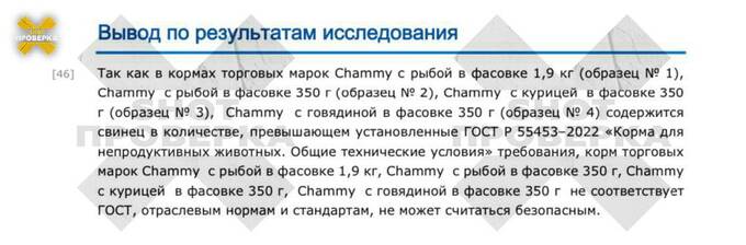 Фонд охраны качества продуктов питания и упаковки "Закон и здоровье" провёл независимую экспертизу продукции после получения обращений от владельцев животных, которые отравились кормом Chammy. Обнаруженный в упаковке свинец мог запросто попасть в корма из-за некачественного материала.