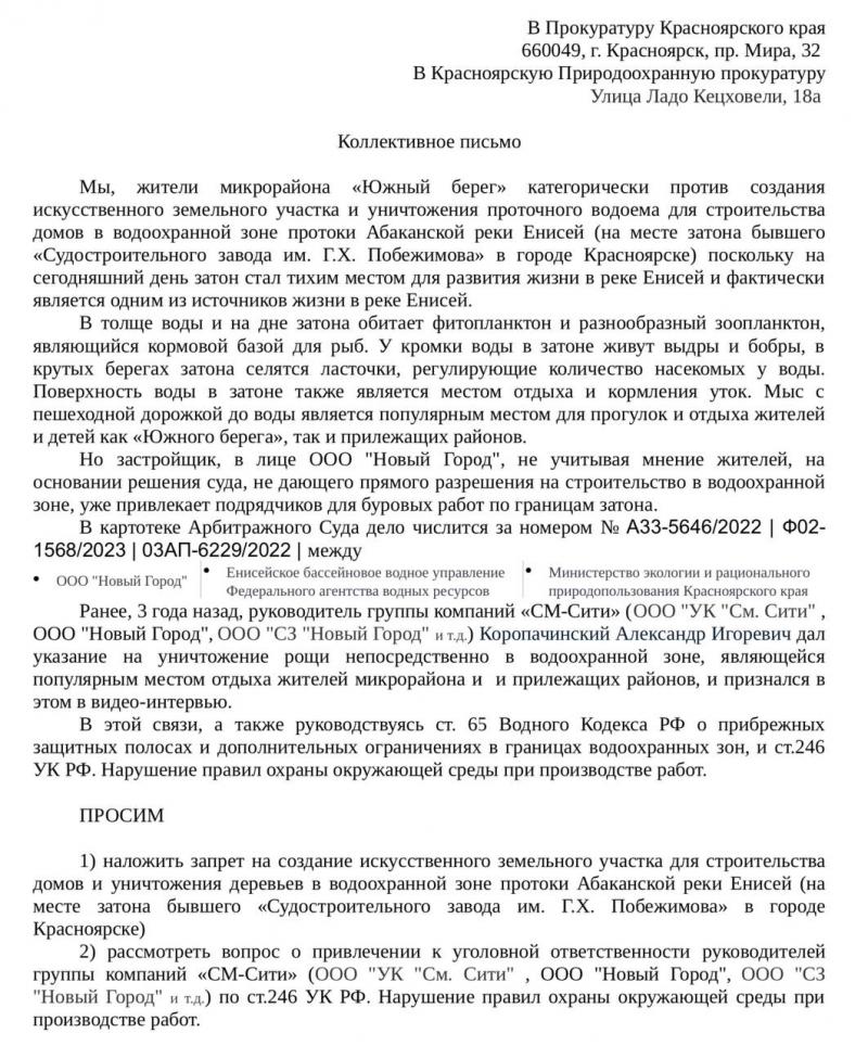 Поэтому красноярцы беспокоятся, что может произойти бедствие, подобное тому, как бывало в Тайшете (Иркутская область), Чите (Забайкальский край) и Орске (Оренбургская область). У граждан возникают закономерные вопросы: почему их жизни и имущество подвергаются опасности, губится прекрасная пресноводная река, вырубаются зелёные насаждения, гибнет экосистема, создается дополнительная нагрузка на городской бюджет. И всё это — ради алчного желания застройщиков (как следует из видеозаписи их встречи с инициативной группой) постоянно продавать квартиры с видом на реку. Неужели в Красноярске закончились участки суши?