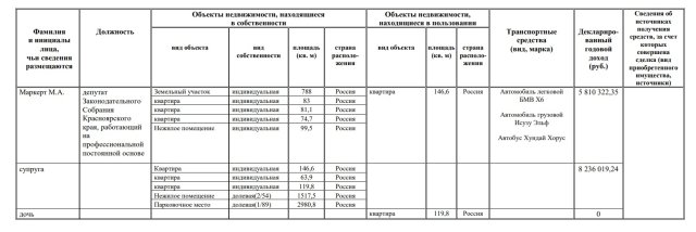 Так, за 2021 год Максим Маркерт задекларировал 5,8 миллиона рублей дохода. В его собственности – земельный участок почти на 800 квадратных метров, три квартиры (81, 83 и 74 квадратных метра), нежилое помещение 99 квадратных метров. В автопарке справедливоросса – легковой BMW Х6, грузовой «Исузу Эльф» и автобус «Хундай Хорус». Супруга Маркерта за 2021 год задекларировала 8,2 миллиона рублей. Женщина владеет квартирой в 146 квадратов, в которой и проживает супружеская пара, а также еще двумя квартирами: на 64 и 120 квадратных метров. Итого чета Маркертов владеет в совокупности шестью квартирами, а их совместный доход составляет 14 миллионов рублей – все это не очень вяжется с образом борца за финансовое равенство, который на себя примерил депутат-справедливоросс.