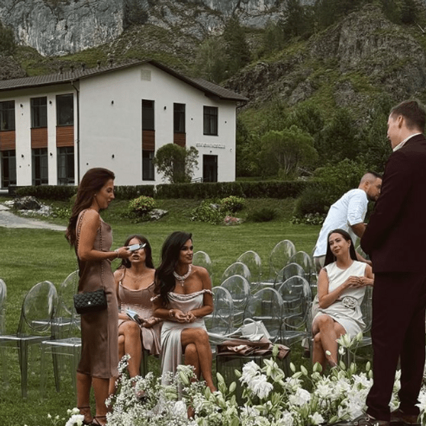 К услугам гостей комплекса предоставлены баня, бассейн с подогревом, терраса с лежаками и видом на реку Катунь, тренажерный зал и ресторан. Перелеты, трансфер из аэропорта в отель, визажист, организатор, световое и звуковое оборудование, фото- и видео съёмка, гонорары приглашенным артистам — обошлись молодоженам в круглую сумму.