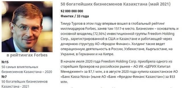 Но это не все. Дело в том, что Freedom Holding Corp обрабатывает сделки в США для казахстанских и российских клиентов Турлова. Она внесла целых 70% комиссионных сборов Freedom Finance от торгов акциями за первую половину 2021 финансового года. Это данные не кого-нибудь, а Forbes, так что им можно вполне верить.